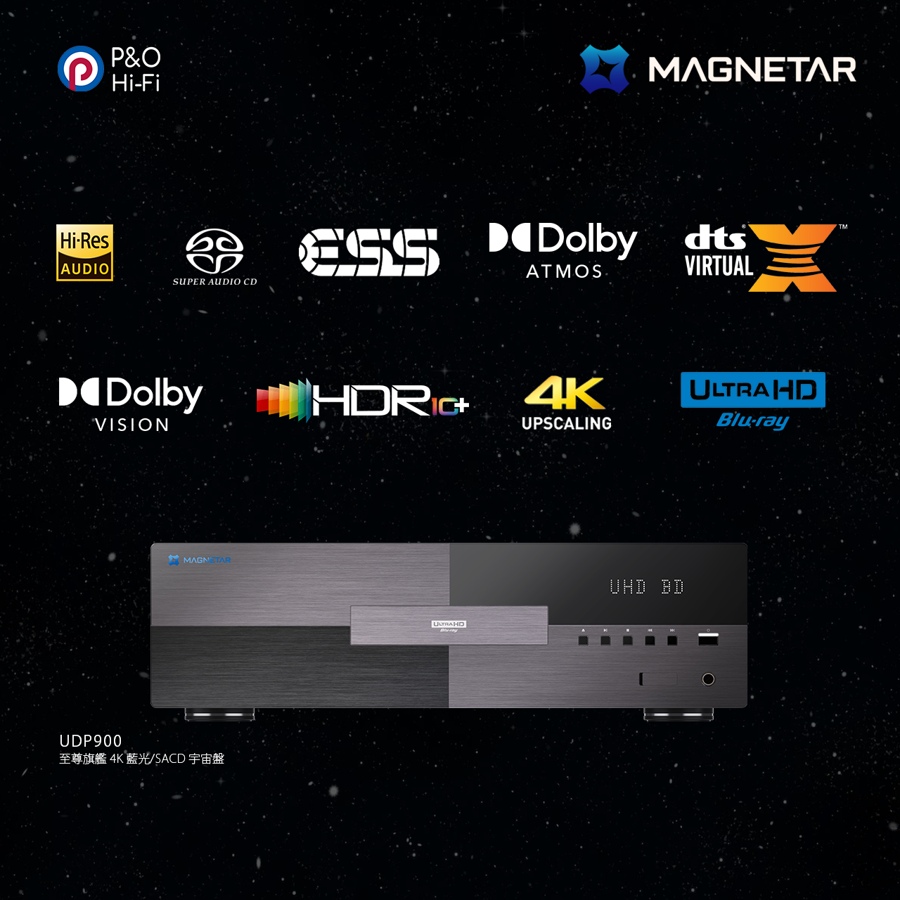 預設支援最常見的 Dolby Vision 杜比視界及 HDR 10+ 高動態範圍標準,具備先進的影像解碼與處理技術,為 HDR 及 4K 超高清影像作最佳化處理,更可精準微調亮度、對比度、色調、飽和度、清晰度等畫面特性,配合專業影像調校以補償其他設備的不足,也可自訂成適合自己的口味。 MAGNETAR UDP900 用上發燒級 SABRE ESS9038PRO 解碼晶片作兩聲道輸出,機內兩塊音訊處理板都採用 4 層 PCB 電路板,每路獨立走線設計,搭載高精度、超低相噪 TXCO 溫補晶振,大量採用 ELNA、NCC 音訊電容,搭配紅WIMA補品電容、ELNA SILMIC II 棕神電容,以及獨立大功率線性電源模組,提供更高好的Hi-Fi音質。